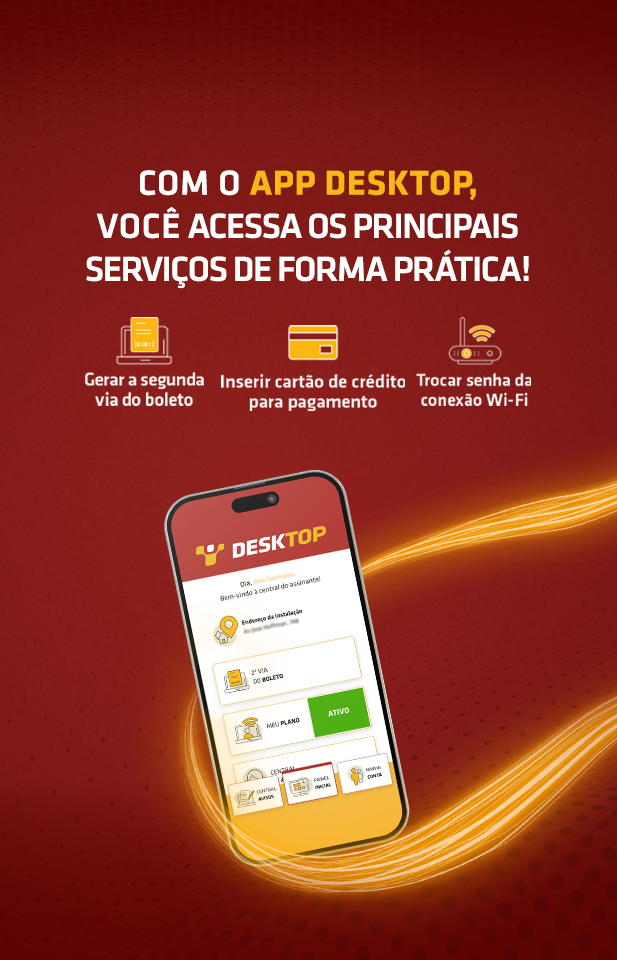 No aplicativo da Desktop, você pode solicitar a 2ª via do boleto, alterar a senha do Wi-Fi e conferir todas as informações sobre o seu plano.